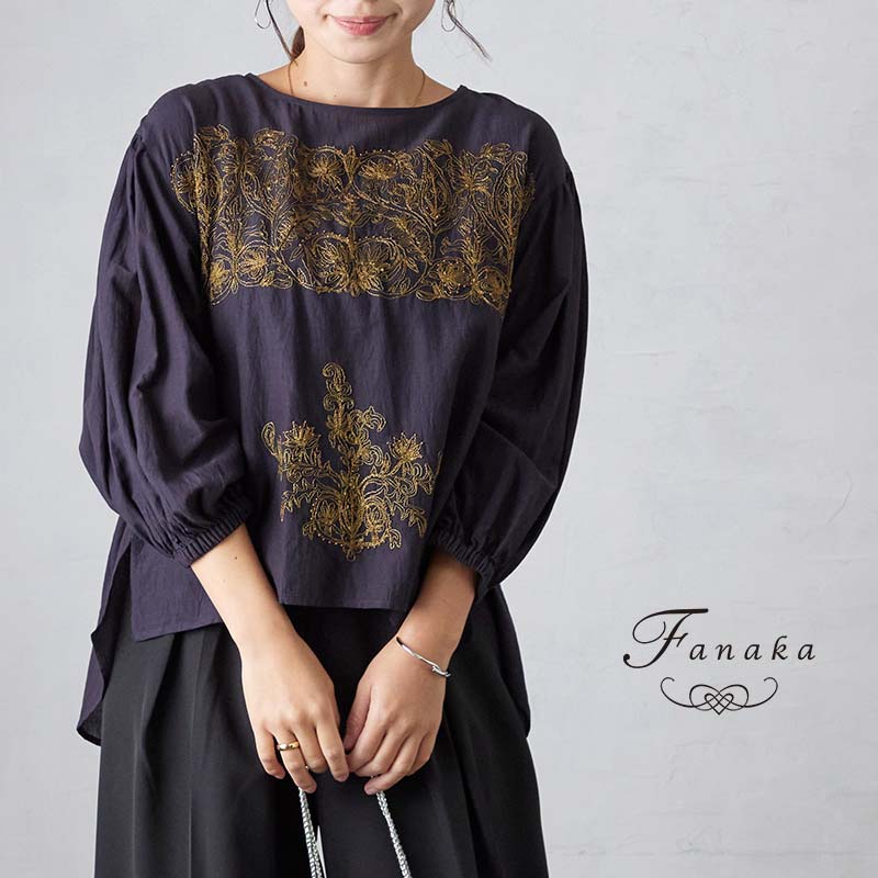肌触りが良く落ち感のある素材にインドの伝統的な刺繍を施したブラウス。光沢のある刺繍で上品。ゆったりしたサイズ感ですがボートネックで首回りがキレイに見えてすっきりシルエット